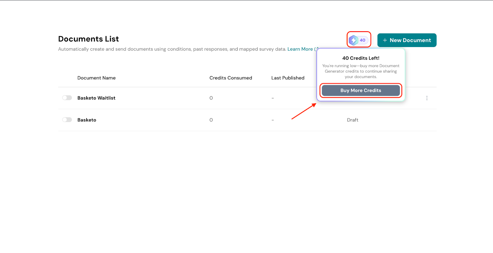 The document generation credits get consumed according to the Report Count. To purchase additional credits, hover over your credit limit and click Buy Credits to proceed with the purchase.