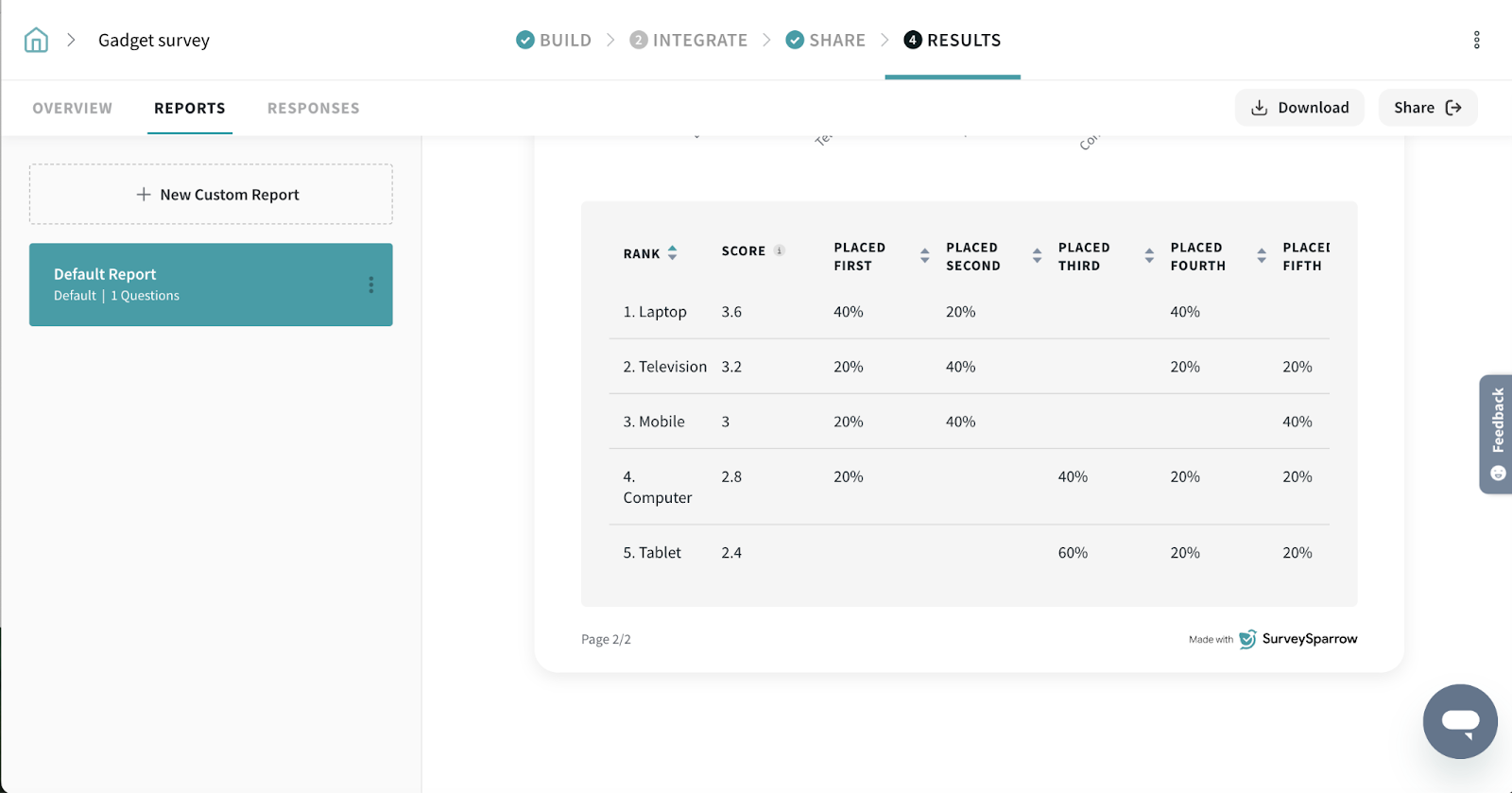 Under Results -> Responses, when your survey gets new responses, you will find the respondents’ choices to your rank order question aligned in their chosen order. Refer to the screenshot below.